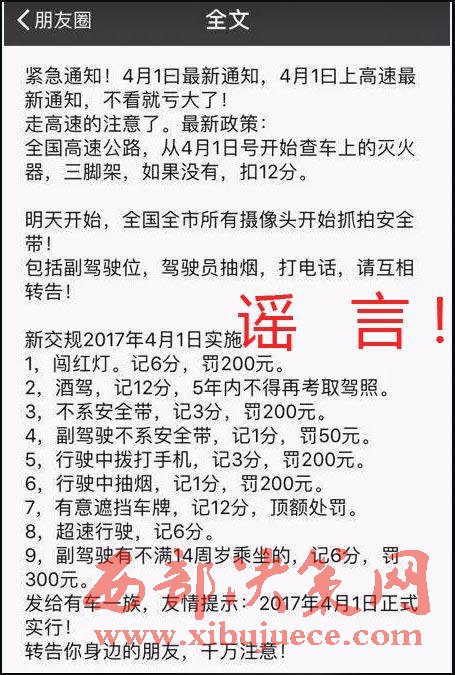 1.【謠言】“4月1日起高速上查車,沒有滅火器扣12分;同時新交規(guī)開始實(shí)施……”近日,這則關(guān)于“4月1日起新交通法規(guī)將實(shí)行”的消息出現(xiàn)在多地網(wǎng)民的微信朋友圈中。在網(wǎng)傳的消息中,“不系安全帶記3分、罰200元,副駕駛不系安全帶記1分、罰50元,行駛中撥打手機(jī)記3分、罰200元,行駛中抽煙記1分、罰200元……”種種條款讓網(wǎng)民頗為緊張。