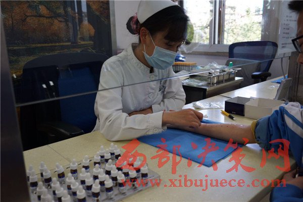 4月11日,北京大學(xué)世紀(jì)壇醫(yī)院變態(tài)反應(yīng)科化驗(yàn)室醫(yī)務(wù)人員在給患者做過敏源檢測。今年3月以來,這個科室就診人數(shù)從平時的日均100多人猛增到300多人。新華網(wǎng)韓家慧攝