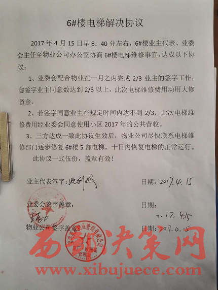 最新進(jìn)展:4月15日,業(yè)主委員會和凱躍物業(yè)達(dá)成維修協(xié)議,業(yè)委會配合物業(yè)在一月之內(nèi)完成2/3 業(yè)主的簽字工作,電梯維修費(fèi)使用大修資金。如果在規(guī)定時間內(nèi)達(dá)不到2/3業(yè)主簽字,則使用小區(qū)2017年的公共營收。三方協(xié)議達(dá)成后,由凱躍物業(yè)盡快聯(lián)系電梯維修公司,十日內(nèi)恢復(fù)電梯的正常運(yùn)行。