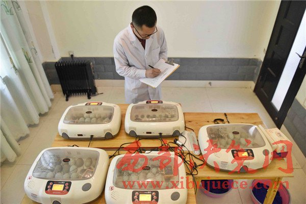 4月19日,工作人員在觀察記錄人工孵化朱鹮卵的情況。