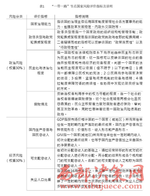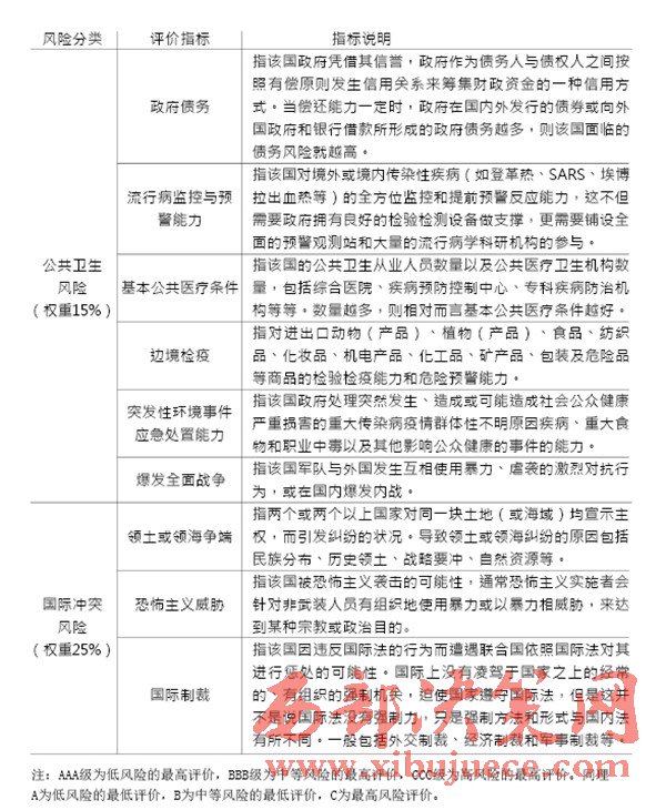 “一帶一路”建設中重要國家的治理風險是我們的主要關注對象,在借助國內外智庫和科研院所已完成的眾多研究成果的基礎上,建立一套對節(jié)點國家風險的評級體系,如表1(見P28)所示。節(jié)點國家風險評價指標中,政治風險與經(jīng)濟風險的評價參考經(jīng)濟學人智庫的國家風險模型(EIU country risk model);公共衛(wèi)生風險的評價參考中國衛(wèi)生與經(jīng)濟社會發(fā)展統(tǒng)計數(shù)據(jù)庫對公共衛(wèi)生的指標設計;國際沖突風險評價根據(jù)經(jīng)濟學人智庫發(fā)布的白皮書《愿景與挑戰(zhàn)——“一帶一路”沿線國家風險評估》與中國出口信用保險公司發(fā)布的2015年版《國家風險分析報告》和《全球風險地圖》綜合考量得出。具體而言,我們可以從“政治風險”“經(jīng)濟風險”“公共衛(wèi)生風險”和“國際沖突風險”四個維度來評估選擇出的節(jié)點國家的風險,如表2(見P30)所示。