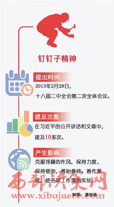 2013年2月28日,在十八屆二中全會(huì)第二次全體會(huì)議上,習(xí)近平首次對釘釘子精神進(jìn)行了詳細(xì)闡述:我們要有釘釘子的精神,釘釘子往往不是一錘子就能釘好的,而是要一錘一錘接著敲,直到把釘子釘實(shí)釘牢,釘牢一顆再釘下一顆,不斷釘下去,必然大有成效。如果東一榔頭西一棒子,結(jié)果很可能是一顆釘子都釘不上、釘不牢。在之后的公開場合,習(xí)近平10余次提及釘釘子精神。