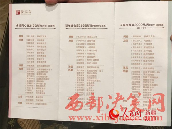 烏魯木齊市長福宮天津路店的婚宴套餐菜單。