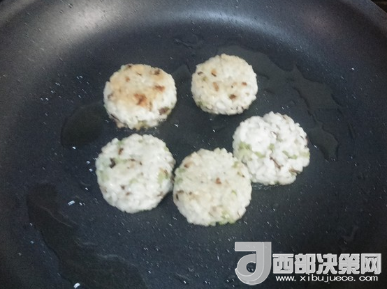 5.拌好的米飯,取適量捏成圓餅狀,鍋里放入適量的油;待油熱后,放入捏好的米餅,中火,一邊煎至金黃,翻面煎另一邊至金黃即可出鍋
