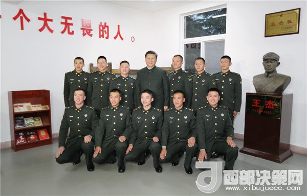 離開連隊榮譽室后,習(xí)近平來到“王杰班”。全班戰(zhàn)士列隊歡迎,習(xí)近平微笑著同他們一一握手?,F(xiàn)任班長王大毛向習(xí)近平介紹了戰(zhàn)士們爭做王杰傳人的情況。50多年來,連隊每天點名第一個呼點王杰??吹酵踅芫裨谶B隊得到很好傳承,看到尊崇英雄、學(xué)習(xí)英雄氛圍這么濃厚,習(xí)近平很欣慰。他招呼戰(zhàn)士們圍坐一圈,詳細詢問大家的學(xué)習(xí)、訓(xùn)練、生活情況,勉勵大家再接再厲,帶頭做新時代王杰式的好戰(zhàn)士。離開連隊時,習(xí)近平同全連官兵合影留念,指戰(zhàn)員們簇擁著習(xí)近平,充滿了幸福和喜悅。全連官兵齊唱連歌“王杰的槍我們扛”,表達了廣大官兵堅決聽習(xí)主席的話、自覺做英雄傳人的堅定決心。