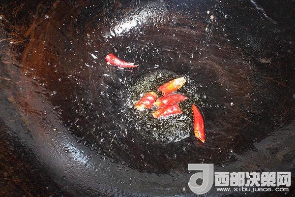 6.把油倒出來,留少許底油,先煸干辣椒,放大蔥大火炒一下出香氣