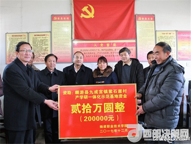 12月15日,為為貫徹落實 《全省脫貧攻堅 2017冬季行動方案》精神,扎實推進高校結對幫扶“雙百工程”,有效地為當?shù)靥厣a(chǎn)業(yè)服務,楊凌職業(yè)技術學院黨委書記趙曼、黨委副書記任得元一行來到麟游縣九成宮鎮(zhèn)紫石崖村,為該村捐贈20萬元,用于建立中蜂養(yǎng)殖產(chǎn)學研一體化示范基地、核桃豐產(chǎn)栽培產(chǎn)學研一體化示范基地及電商網(wǎng)絡平臺。
