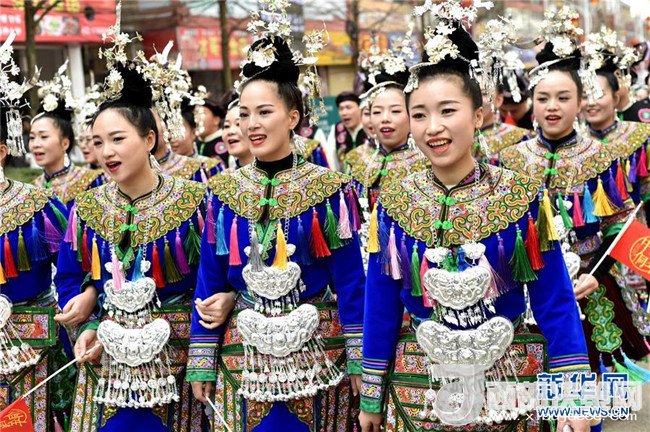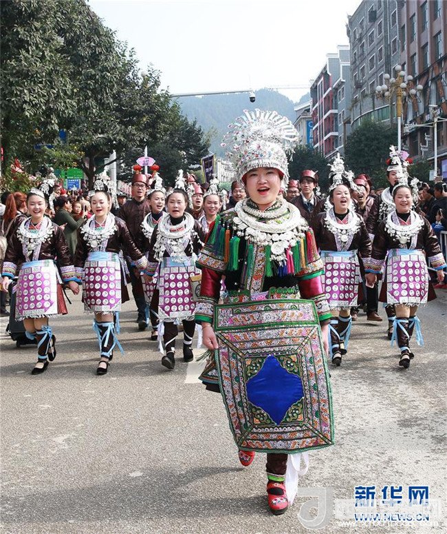 12月18日,身著盛裝的侗族同胞參加巡游。當(dāng)日,2017中國(guó)侗年暨第八屆黎平·中國(guó)侗文化旅游節(jié)“非遺”文化巡游在貴州省黔東南苗族侗族自治州黎平縣舉行,當(dāng)?shù)囟弊逋麣g聚一堂,喜迎侗年到來。(張暉 攝)