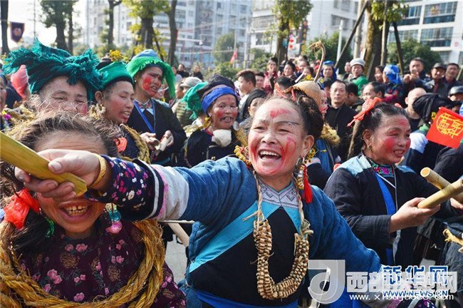12月18日,侗族同胞在巡游中表演“臉花鬧”。當(dāng)日,2017中國(guó)侗年暨第八屆黎平·中國(guó)侗文化旅游節(jié)“非遺”文化巡游在貴州省黔東南苗族侗族自治州黎平縣舉行,當(dāng)?shù)囟弊逋麣g聚一堂,喜迎侗年到來。(喬啟明 攝)