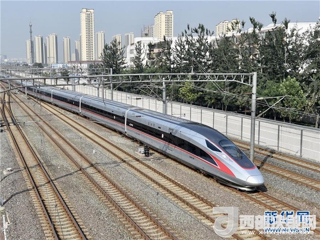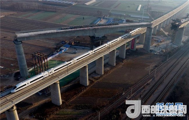 西成高鐵由西安北站駛出的列車經(jīng)過(guò)西成高鐵跨西寶高鐵特大橋(12月6日攝)。12月6日,西安至成都高速鐵路全線開(kāi)通運(yùn)營(yíng),兩地的最短旅行時(shí)間壓縮至4小時(shí)7分。