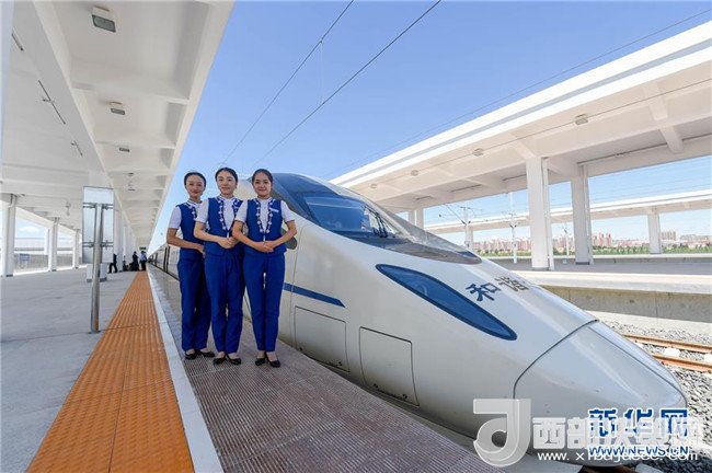 乘務(wù)組人員在烏蘭察布站與動(dòng)車組合影(8月3日攝)。8月3日,內(nèi)蒙古首列高鐵D6980次列車伴隨著嘹亮的汽笛聲,駛出呼和浩特東火車站,以250公里的時(shí)速駛向?yàn)跆m察布站,內(nèi)蒙古自此正式邁進(jìn)高鐵時(shí)代。