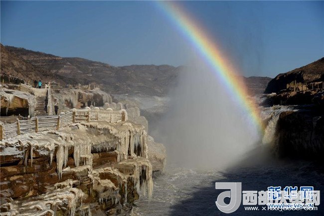 這是12月17日在山西吉縣黃河壺口瀑布拍攝的冰瀑彩虹景觀。當(dāng)日,黃河壺口瀑布出現(xiàn)彩虹景觀。壺口瀑布兩岸姿態(tài)萬千的冰瀑,與瀑布上空的彩虹相映成趣,美不勝收。(呂桂明 攝)