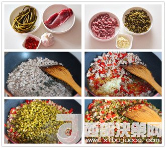 第一步:準備食材。豬瘦肉餡適量、豆角適量、碎米芽菜一包。干辣椒適量、蒜適量。