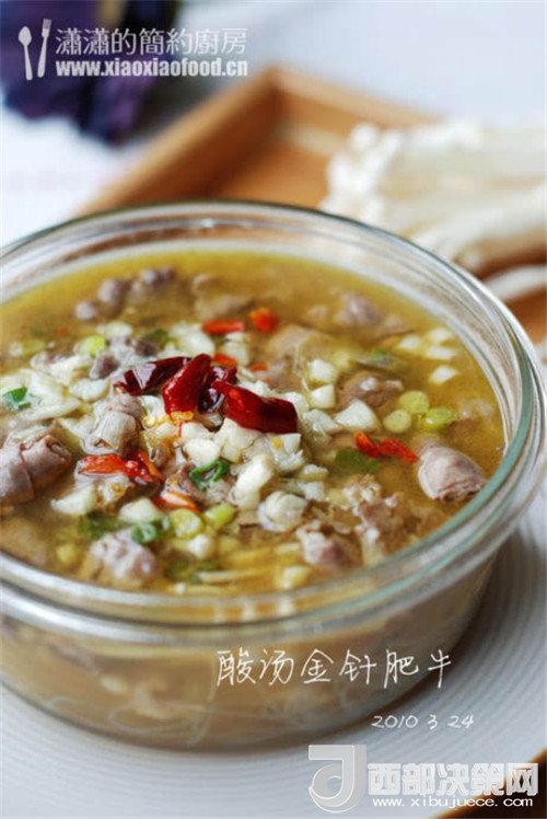 我在網(wǎng)上查了查,酸湯金針肥牛的做法有很多種,但我喜歡的這種突出金湯的特點:湯清澈而呈金黃色,酸得爽口利落,留在舌尖的感覺沒有一般肉菜帶來的滯膩感,倒是有一種清爽的回味。