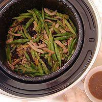 3. 雞蛋炒成塊兒。五花肉切絲,加少許干淀粉和蛋液滑炒制熟。豆角、香菇切絲備用。