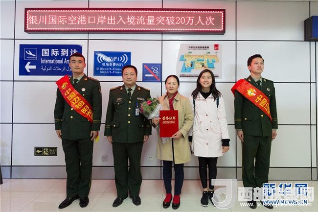 12月27日,在寧夏銀川河東國際機場入境邊防檢查站,邊檢工作人員與2017年驗放的第20萬名旅客劉英(中)及其女兒合影留念。截至12月27日,寧夏銀川空港口岸年度出入境旅客流量首次突破20萬人次,較去年同期增長12.5%。目前,銀川空港口岸已開通至阿聯(lián)酋迪拜、泰國曼谷、越南峴港等地的航線。(杜牧文 攝)