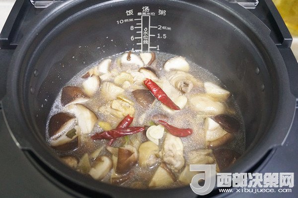 5、再放入香菇塊,加入沒過食材的開水。所有食材都倒入蘇泊爾電壓力鍋的內(nèi)膽中。