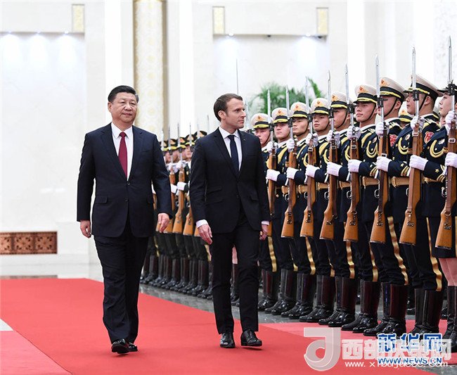 1月9日,國家主席習(xí)近平在北京人民大會堂同法國總統(tǒng)馬克龍舉行會談。這是會談前,習(xí)近平在人民大會堂北大廳為馬克龍舉行歡迎儀式。記者 王曄 攝