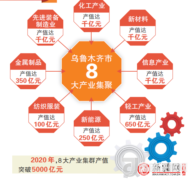 根據(jù)《關于加快烏魯木齊市工業(yè)重點產(chǎn)業(yè)集群發(fā)展的意見》,烏市將加快發(fā)展化工、先進裝備、新材料、新能源、信息、輕工業(yè)、金屬制品、紡織服裝八大產(chǎn)業(yè)集群及產(chǎn)業(yè)集聚區(qū)。到2020年,八大產(chǎn)業(yè)集群產(chǎn)值突破5000億元。其中,化工產(chǎn)業(yè)產(chǎn)值達到“千億”規(guī)模、先進裝備制造產(chǎn)業(yè)產(chǎn)值達到“千億”規(guī)模、硅鋁基電子新材料和高分子膜材料產(chǎn)業(yè)產(chǎn)值達到“千億”規(guī)模、新能源產(chǎn)業(yè)達到250億元規(guī)模、信息產(chǎn)業(yè)產(chǎn)值達到“千億”規(guī)模、輕工產(chǎn)業(yè)達到650億元規(guī)模、金屬制品達到350億元規(guī)模、紡織服裝產(chǎn)業(yè)達到100億元規(guī)模。
