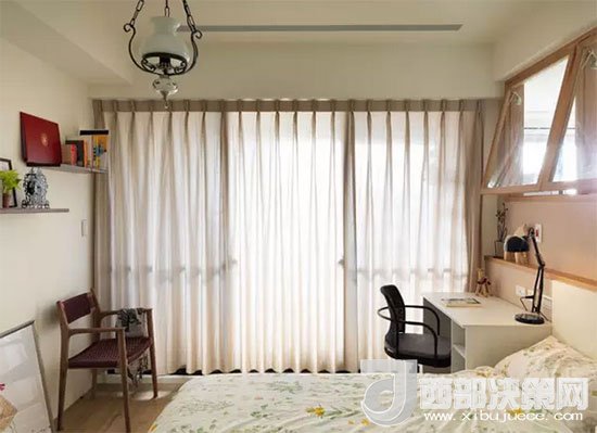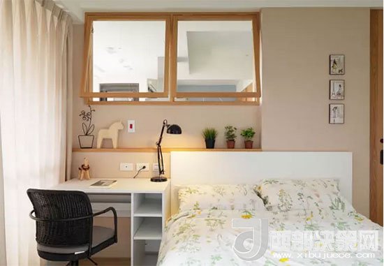 寫(xiě)字臺(tái)緊靠床邊,發(fā)揮了床頭柜的功能,臺(tái)燈也可以當(dāng)做床頭燈,減少不必要的裝飾。房主人利用凹進(jìn)去的墻面正好做了一個(gè)擱物臺(tái),放上幾盆綠植,伴著自己入眠。