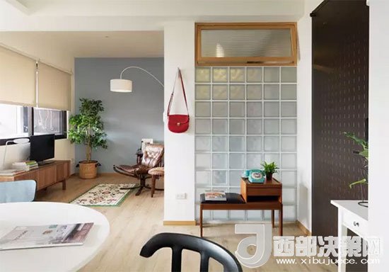 客廳的前方是隔開(kāi)的陽(yáng)臺(tái),背面則是衛(wèi)浴室,一處墻面用玻璃磚代替,增加了衛(wèi)浴室的采光,和白色墻面比起來(lái)更顯通透。