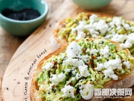 高B格吃法,牛油果配山羊芝士配點兒芝麻和干辣椒,涂在吐司上。