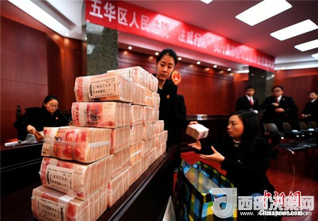 1月23日,發(fā)放現(xiàn)場(chǎng)法院工作人員在整理堆放的現(xiàn)金。當(dāng)日,在2018年春節(jié)臨近之際,昆明市五華法院“法威行動(dòng)”執(zhí)行案款暨司法救助金集中發(fā)放在五華法院進(jìn)行。共對(duì)107件涉民生、涉金融案件發(fā)放執(zhí)行案款約5000萬(wàn)元,同時(shí)對(duì)13起執(zhí)行案件中的14名特困人員發(fā)放司法救助金346000元。此次集中發(fā)放案款暨司法救助金大會(huì),旨在彰顯司法的權(quán)威和司法的人文關(guān)懷,確保申請(qǐng)執(zhí)行人和特困人員的合法權(quán)益得到及時(shí)兌現(xiàn),讓民眾過(guò)上一個(gè)歡樂(lè)祥和的新春佳節(jié)。記者李進(jìn)紅攝