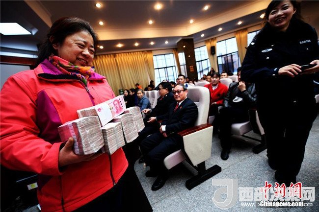 1月23日,發(fā)放現(xiàn)場(chǎng)滿(mǎn)臉笑容的市民抱著領(lǐng)到的現(xiàn)金。當(dāng)日,在2018年春節(jié)臨近之際,昆明市五華法院“法威行動(dòng)”執(zhí)行案款暨司法救助金集中發(fā)放在五華法院進(jìn)行。共對(duì)107件涉民生、涉金融案件發(fā)放執(zhí)行案款約5000萬(wàn)元,同時(shí)對(duì)13起執(zhí)行案件中的14名特困人員發(fā)放司法救助金346000元。此次集中發(fā)放案款暨司法救助金大會(huì),旨在彰顯司法的權(quán)威和司法的人文關(guān)懷,確保申請(qǐng)執(zhí)行人和特困人員的合法權(quán)益得到及時(shí)兌現(xiàn),讓民眾過(guò)上一個(gè)歡樂(lè)祥和的新春佳節(jié)。記者李進(jìn)紅攝