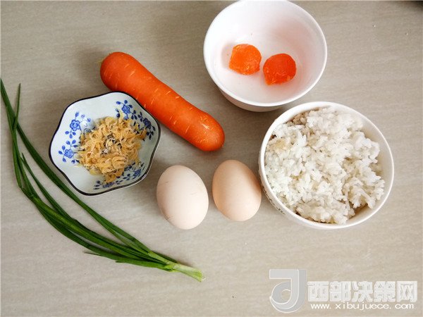 主料:米飯 1碗  咸蛋 2個  蝦皮 3克  胡蘿卜 80克  雞蛋 2個