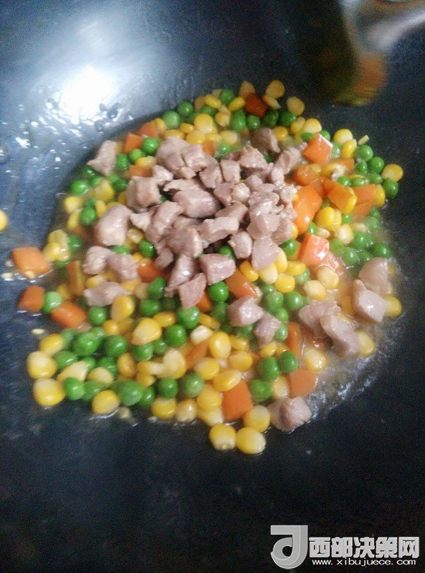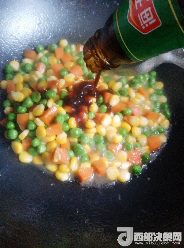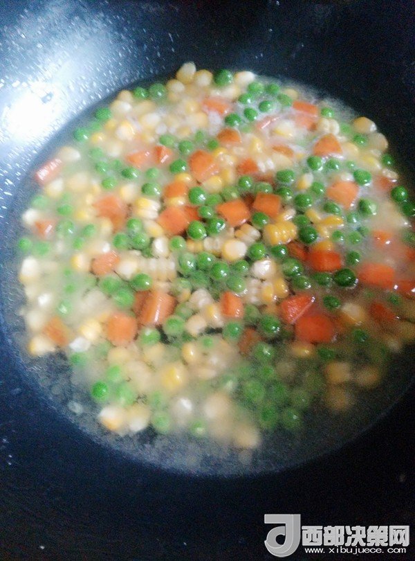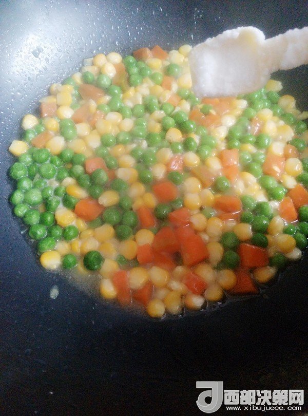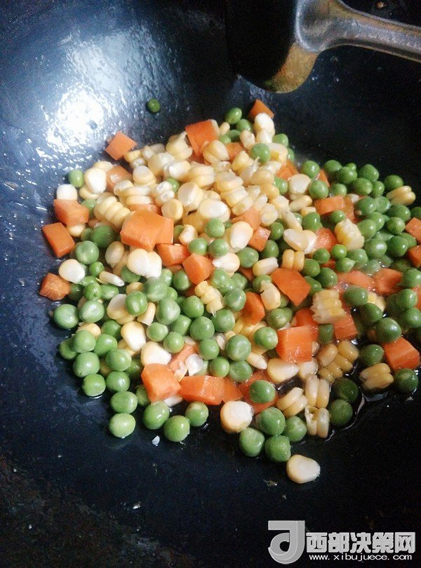 7.鍋留底油,放入豌豆、胡蘿卜、玉米粒炒一會