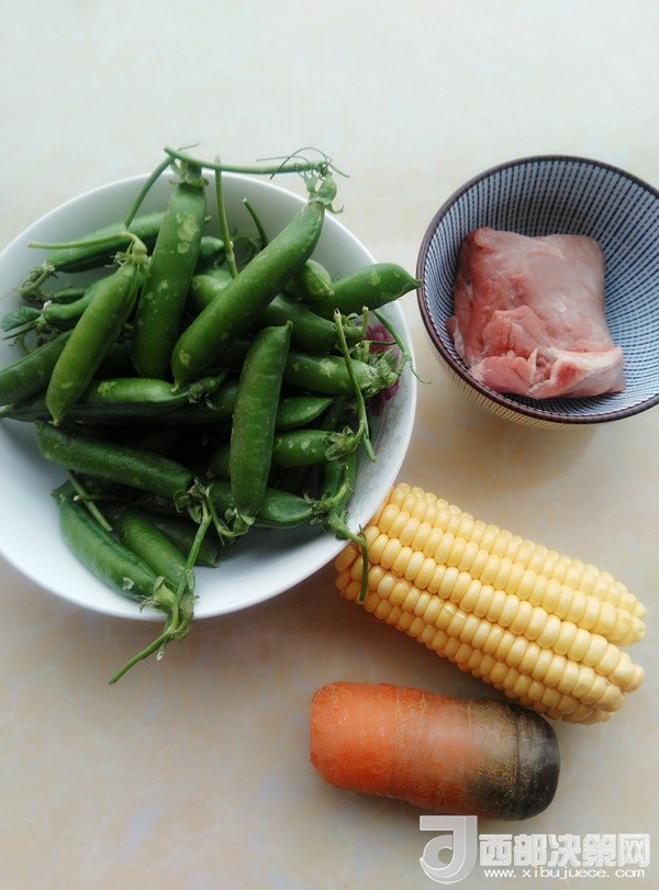 主料:胡蘿卜 1根  玉米 1根  豌豆 300克  里脊肉 100克