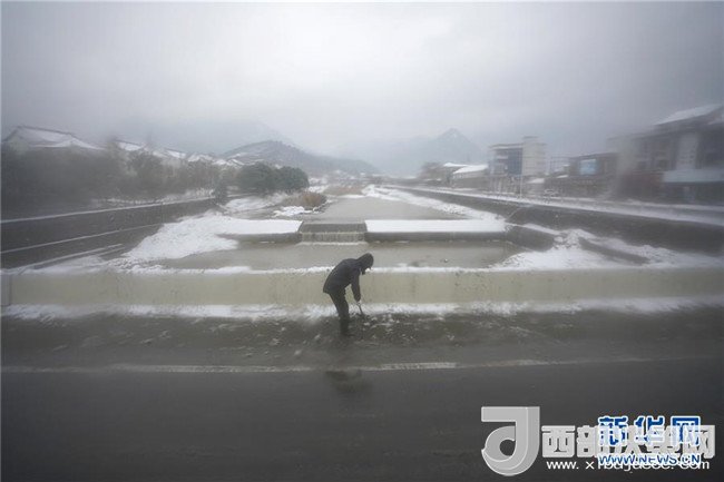 1月25日,一位村民在浙江省湖州市安吉縣清理道路積雪。