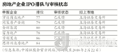 據(jù)中國(guó)證監(jiān)會(huì)最新公布的《發(fā)行監(jiān)管部首次公開發(fā)行股票審核工作流程及申請(qǐng)企業(yè)情況》顯示,截至2018年2月22日,證監(jiān)會(huì)受理首發(fā)企業(yè)438家,其中,已過(guò)會(huì)27家,未過(guò)會(huì)411家。未過(guò)會(huì)企業(yè)中正常待審企業(yè)404家,中止審查企業(yè)7家。其中,在“涉房”企業(yè)中萬(wàn)達(dá)商業(yè)地產(chǎn)、富力地產(chǎn)、同策房產(chǎn)咨詢、金輝集團(tuán)、首創(chuàng)置業(yè)等繼續(xù)保持“已反饋”狀態(tài)。按照申報(bào)企業(yè)排序,分別位列77、78、79、80、86名。