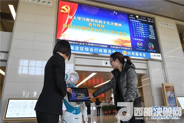 在北京市海淀區(qū)綜合行政服務中心,工作人員(左)向一名女士介紹智能引導機器人的使用方法(2017年11月3日攝)。 新華社記者申宏攝