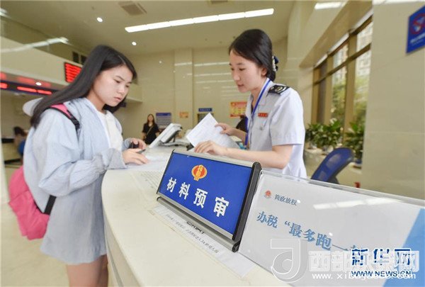 在福建福州地稅綜合辦稅中心辦稅服務廳,工作人員對納稅人材料進行預審,以節(jié)約其等候時間(2017年7月18日攝)。 新華社記者宋為偉攝