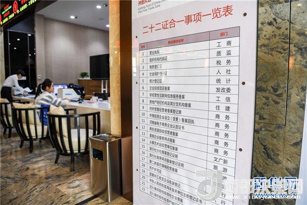 河南自貿區(qū)開封片區(qū)綜合服務中心內的“二十二證合一事項一覽表”(2017年6月16日攝)。新華社記者李博攝