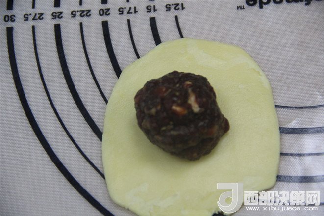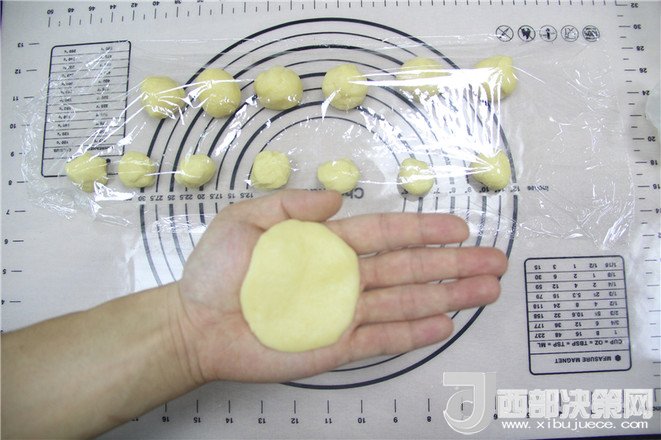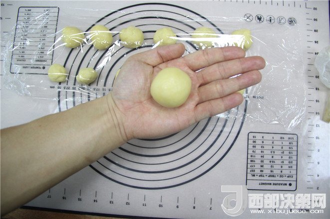 11.把油皮分割成6個25克,油心分成6個20克,分別揉成團。
