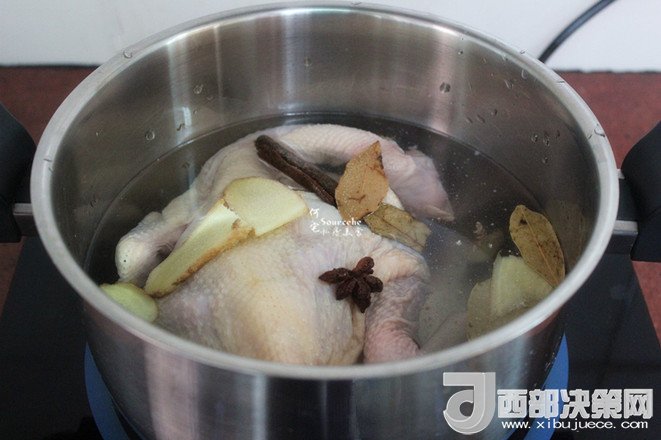 3.把洗凈的整只雞放入鍋中,然后放桂皮、生姜、香葉、八角,料酒、鹽,再倒入適量的清水,水要浸沒整只雞即可;