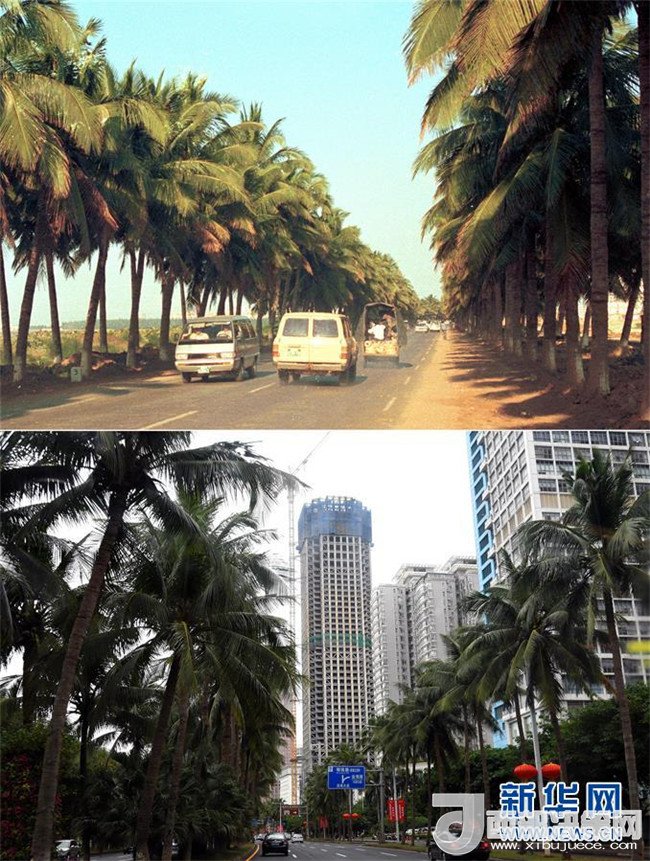 拼版照片為海口市濱海大道南側(cè)的建筑物今昔對(duì)比(上圖為1990年1月10日新華社記者姜恩宇攝,下圖為2018年4月15日新華社記者趙穎全攝)。