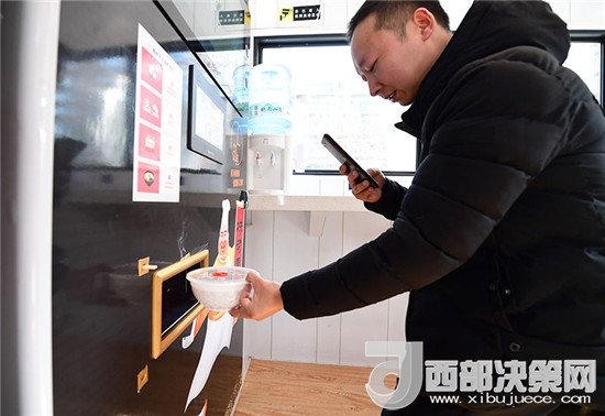 在位于西安曲江創(chuàng)客大街邊的一家無人面館內(nèi),市民用手機(jī)拍攝機(jī)器剛做好的面食(1月10日攝)。新華社記者 邵瑞 攝