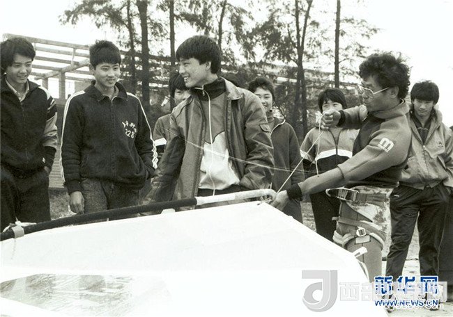 來(lái)自臺(tái)灣的帆板運(yùn)動(dòng)員在海口和當(dāng)?shù)厝罕娊涣鳎?989年1月16日攝)。新華社記者 姜恩宇 攝