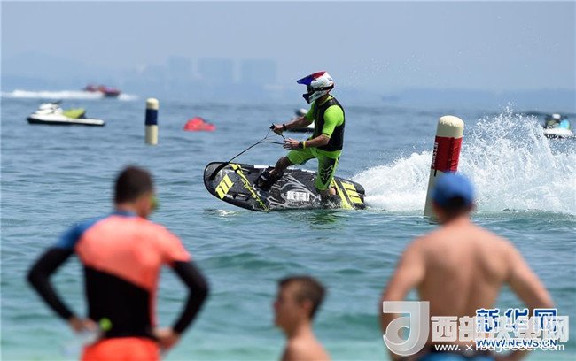 在三亞蜈支洲島參加2016動(dòng)力沖浪板國(guó)際賽中國(guó)站的選手在比賽中(2016年9月17日攝)。新華社記者 楊冠宇 攝