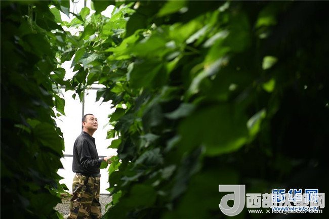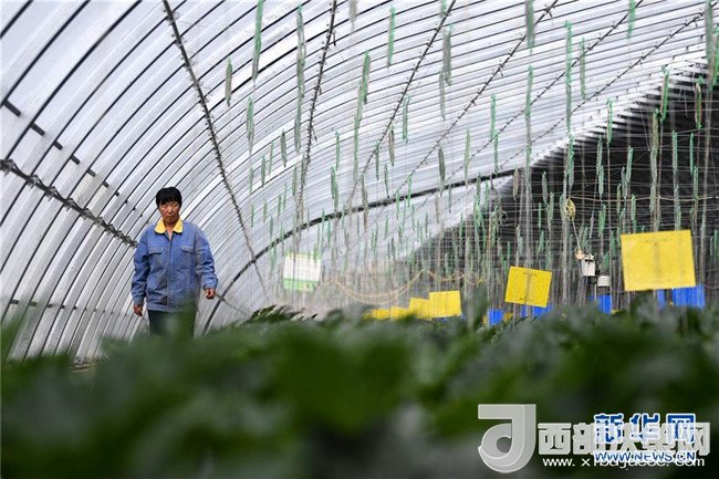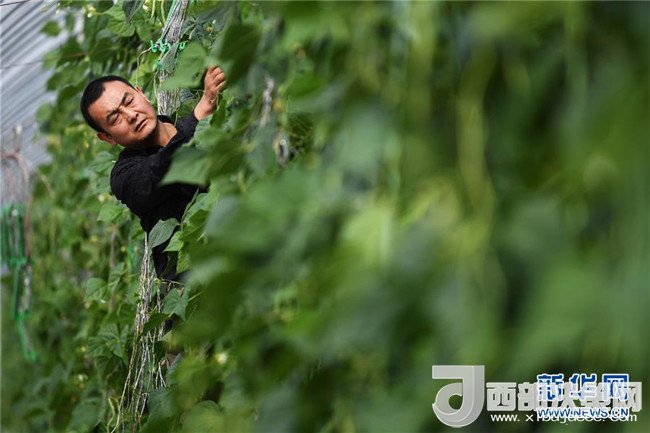 4月18日,甘肅省酒泉市肅州區(qū)總寨鎮(zhèn)總寨村村民范立德在戈壁農業(yè)產業(yè)園的日光溫室內查看蔬菜生長情況。