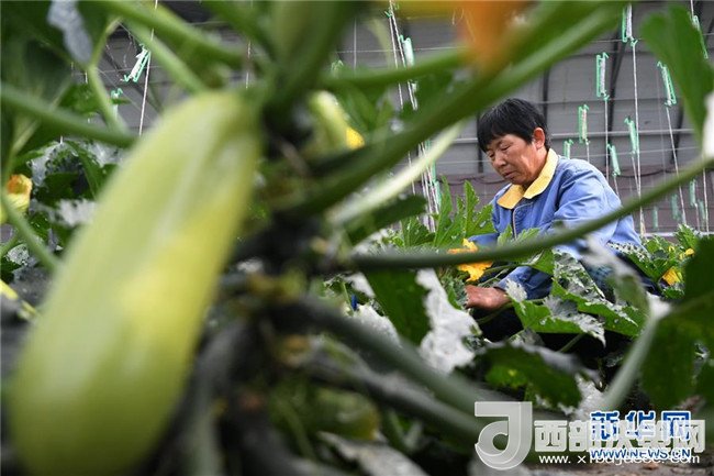 4月18日,一位村民在甘肅省酒泉市肅州區(qū)總寨戈壁農業(yè)產業(yè)園的日光溫室內采摘蔬菜。