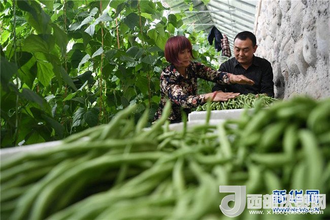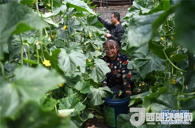 4月18日,甘肅省酒泉市肅州區(qū)總寨鎮(zhèn)總寨村村民范立德(后)和妻子在日光溫室內采摘蔬菜。