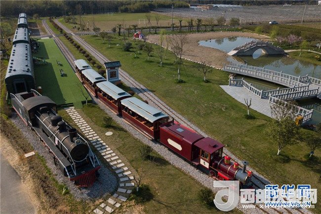 游客乘坐觀光小火車從浙江省安吉縣魯家村的休閑驛站邊駛過(3月23日無人機拍攝)。