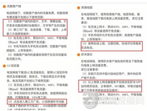 以優(yōu)酷和中國電信合作的“大小魚卡”為例,其說明顯示,“優(yōu)酷視頻專屬流量不包括優(yōu)酷客戶端內(nèi)圖片、文字、彈幕加載、打開優(yōu)酷視頻時加載圖片、文字等產(chǎn)生的流量。”當然,第三方廣告也不在內(nèi)。