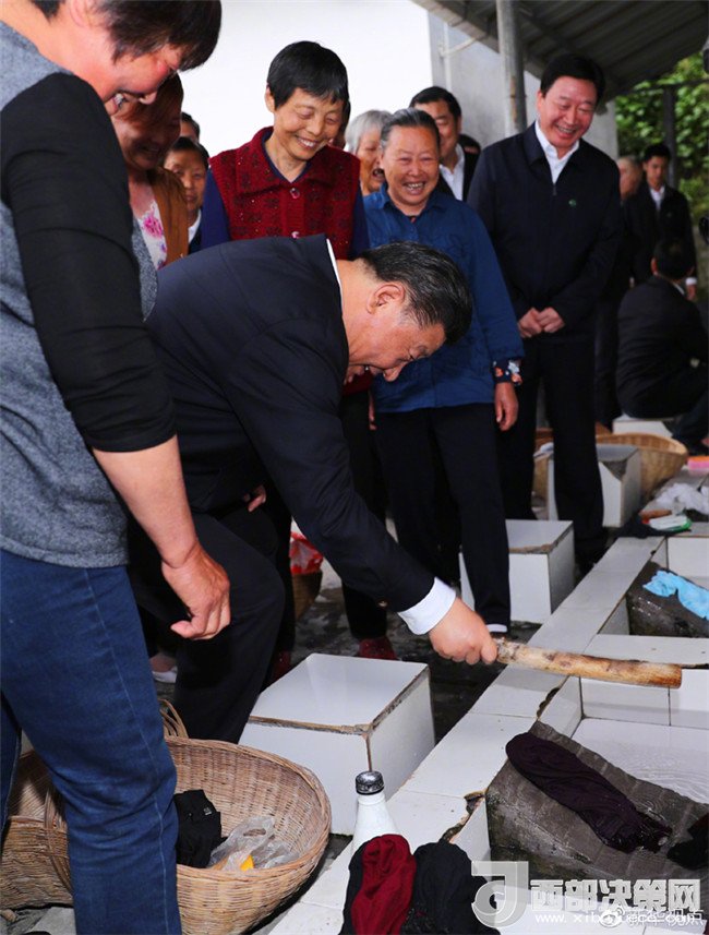 正在村里洗衣服的幾位村民告訴總書記,過去是在江邊洗衣服,現(xiàn)在村里建起了便民洗衣池,用上了自來水,污水集中處理,既尊重了生活習(xí)慣又很環(huán)保??倳浗舆^洗衣用的棒槌,俯下身,試著捶打了幾下衣服,說:現(xiàn)在洗衣服也是綠色環(huán)保的了。習(xí)近平說,看見大家日子過得好,我高興!