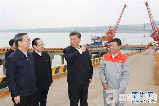 4月26日下午,中共中央總書記、國家主席、中央軍委主席習(xí)近平在武漢主持召開深入推動(dòng)長江經(jīng)濟(jì)帶發(fā)展座談會(huì)并發(fā)表重要講話。這是座談會(huì)前,習(xí)近平于24日中午到興發(fā)集團(tuán)宜昌新材料產(chǎn)業(yè)園,察看化工企業(yè)搬遷、改造以及碼頭復(fù)綠情況。新華社記者 鞠鵬 攝