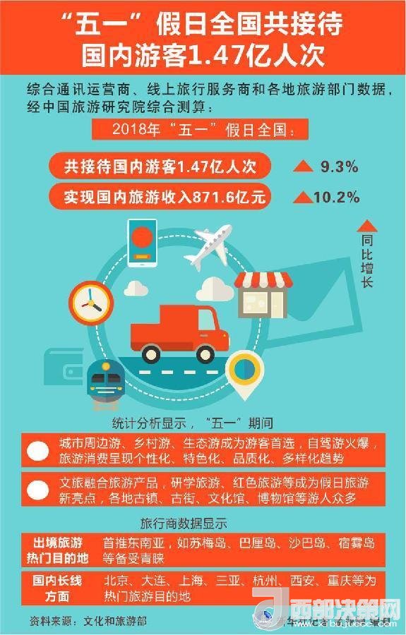 “五一”期間,全國假日旅游消費(fèi)旺盛,旅游市場(chǎng)持續(xù)增長。綜合通訊運(yùn)營商、線上旅行服務(wù)商和各地旅游部門數(shù)據(jù),經(jīng)中國旅游研究院綜合測(cè)算,“五一”假日全國共接待國內(nèi)游客1.47億人次,同比增長9.3%,實(shí)現(xiàn)國內(nèi)旅游收入871.6億元,同比增長10.2%。